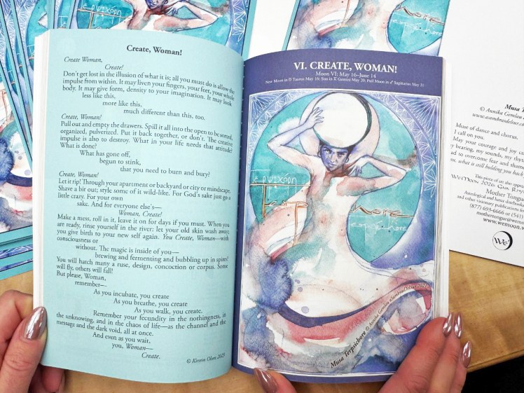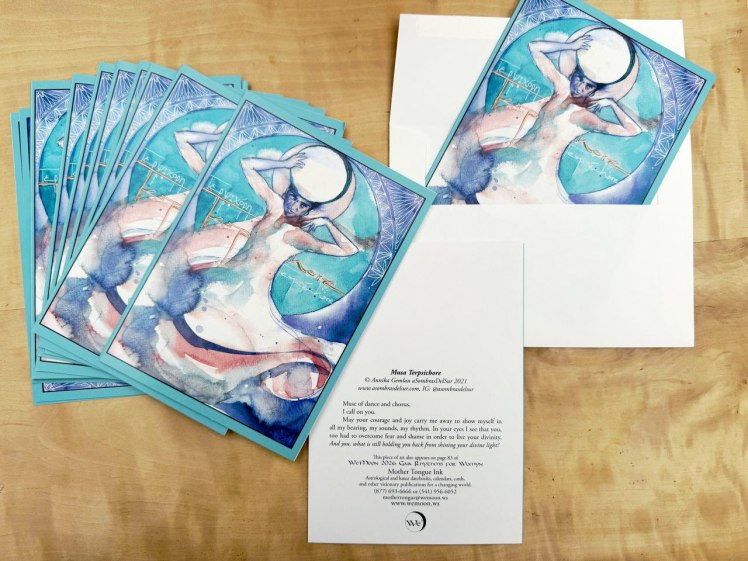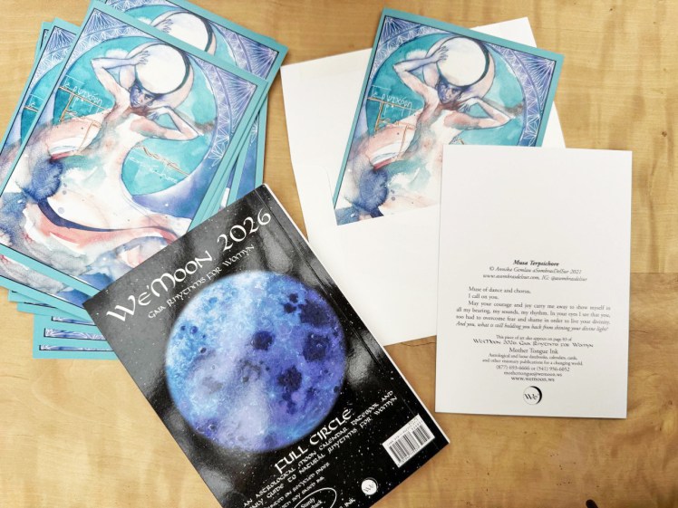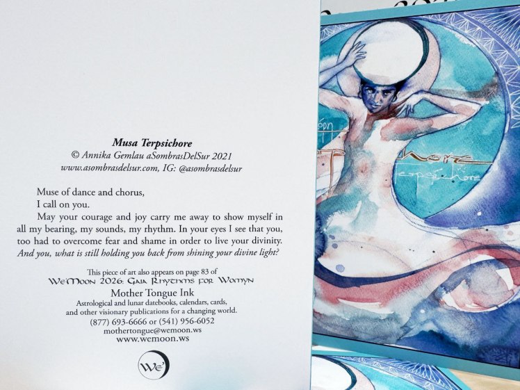 Wie schon in einigen Jahren zuvor wählten auch 2026 die Herausgeber des We’Moon Kalenders zwei meiner Bilder für ihre aktuelle Ausgabe aus. Zusätzlich zum Druck im Mondkalender wurde mein Motiv „Terpsichoré – Muse of Dance“ als eines der sechs Bilder ausgewählt, die als Grußkarte herausgegeben werden.