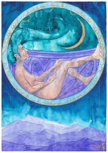 BAJO LUNA ÁRABE postcard 21,2 x 10 cm ©annikagemlau2015 — „under arabic moon“, words in arabic: moon, earth, sun (from right to left)